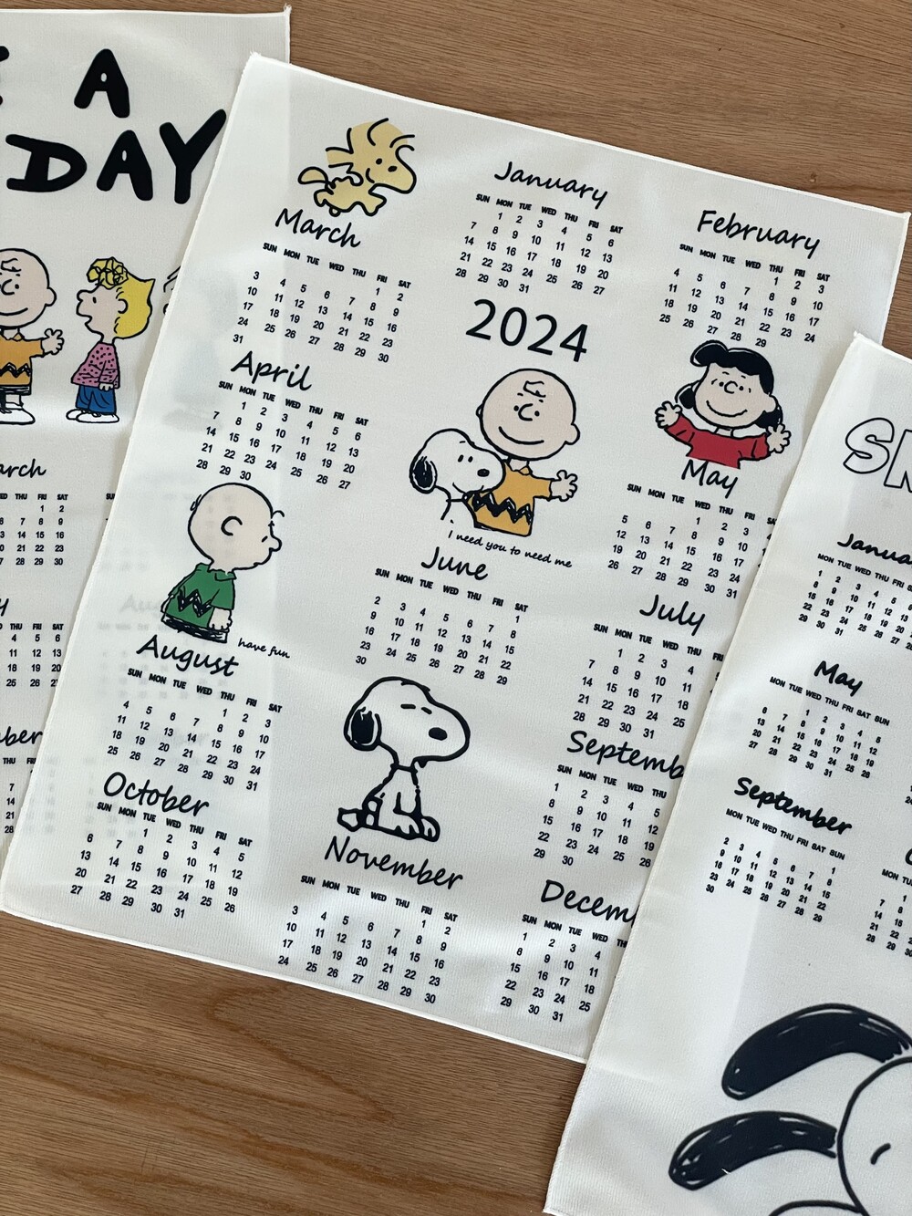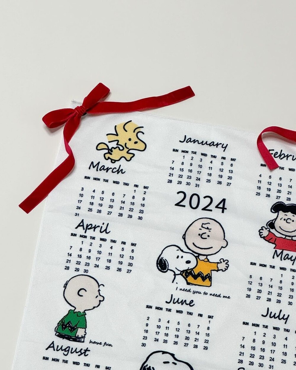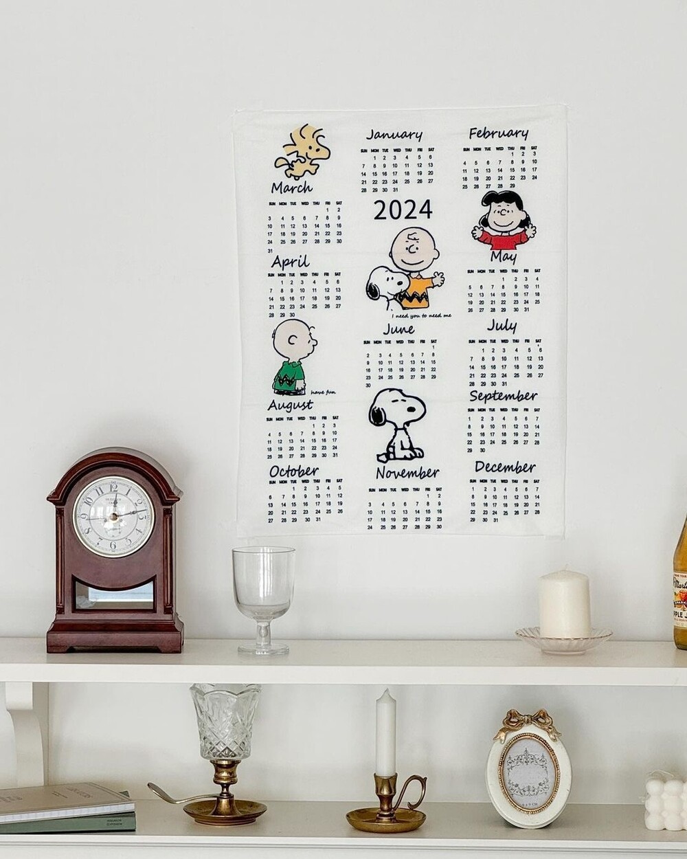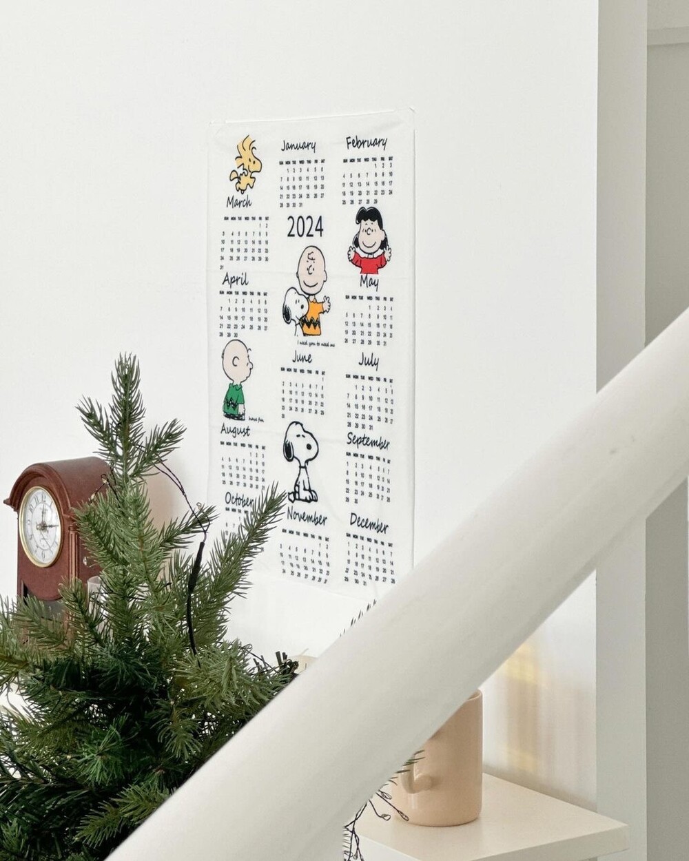 귀여운 스누피 친구들이 그려진 2024 패브릭 캘린더입니다.