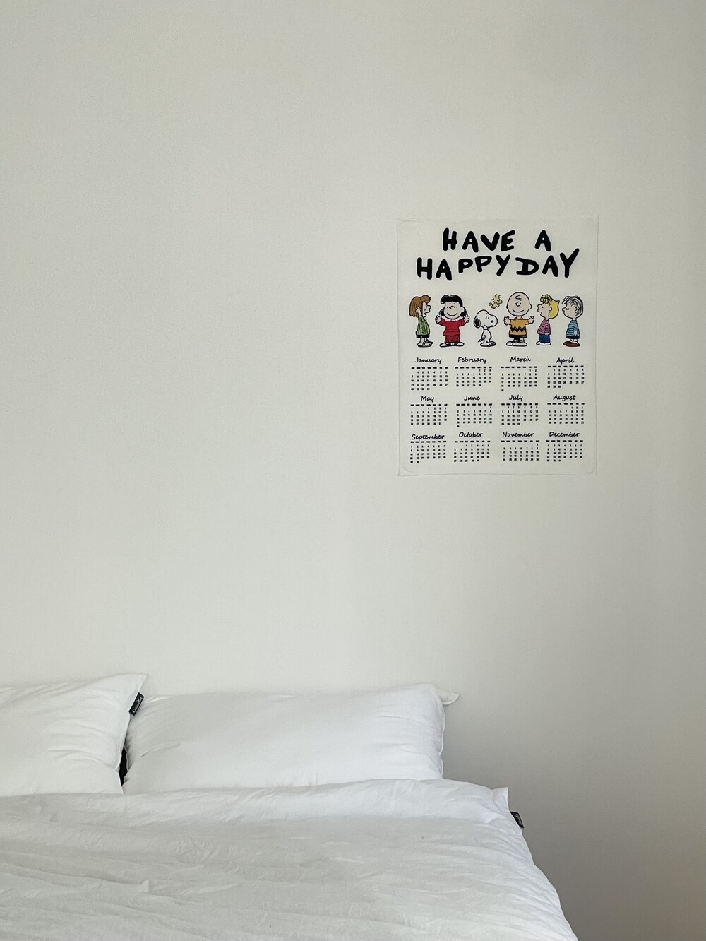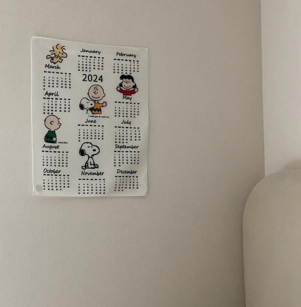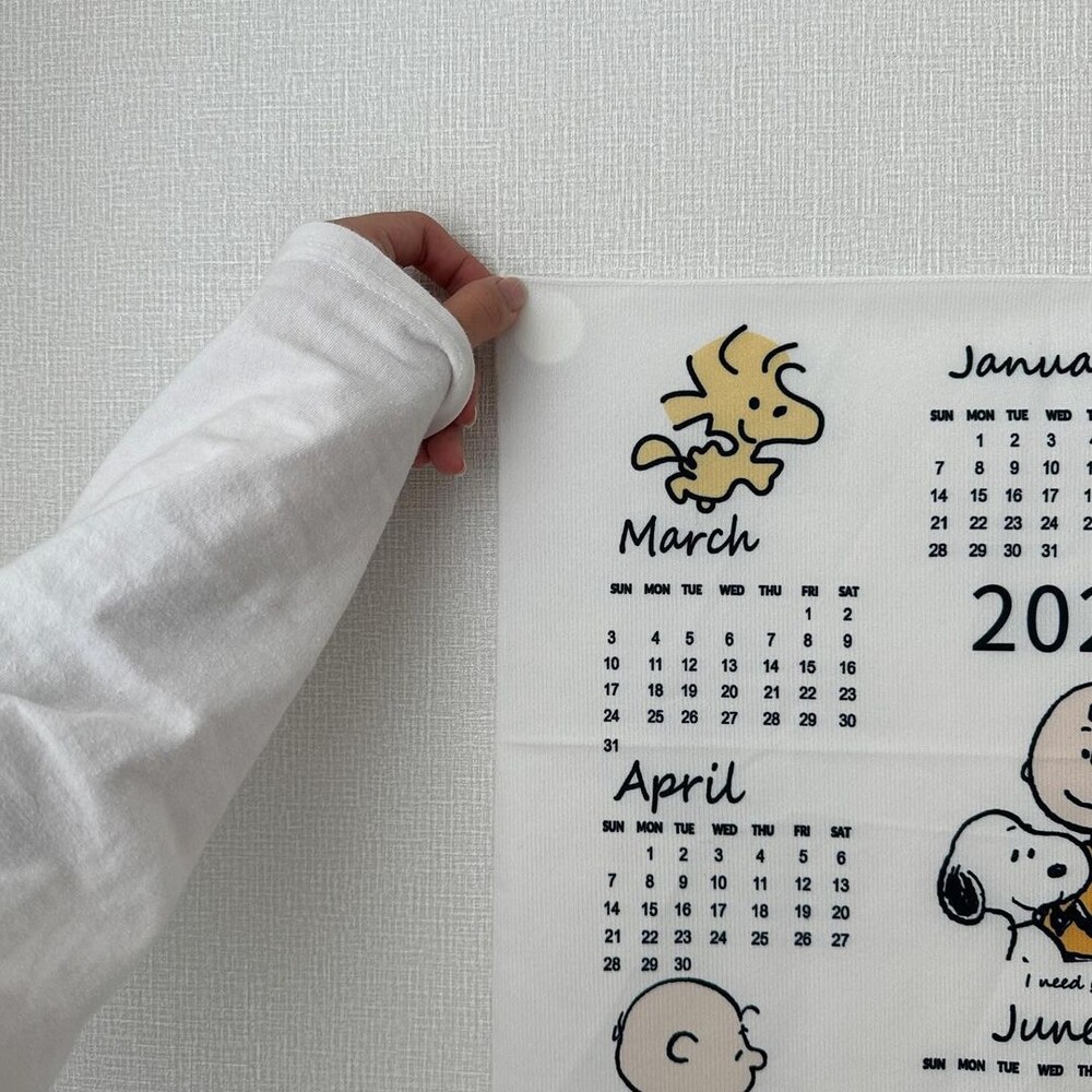 "우리집 곳곳 어디든 두어도 이쁜 페브릭 달력. 엄마 최애 캐릭터가 스누핀데 너도 좋아할줄 알았지! 손가락으로 가리키며 멈머하는데 귀여워 미쵸♥"