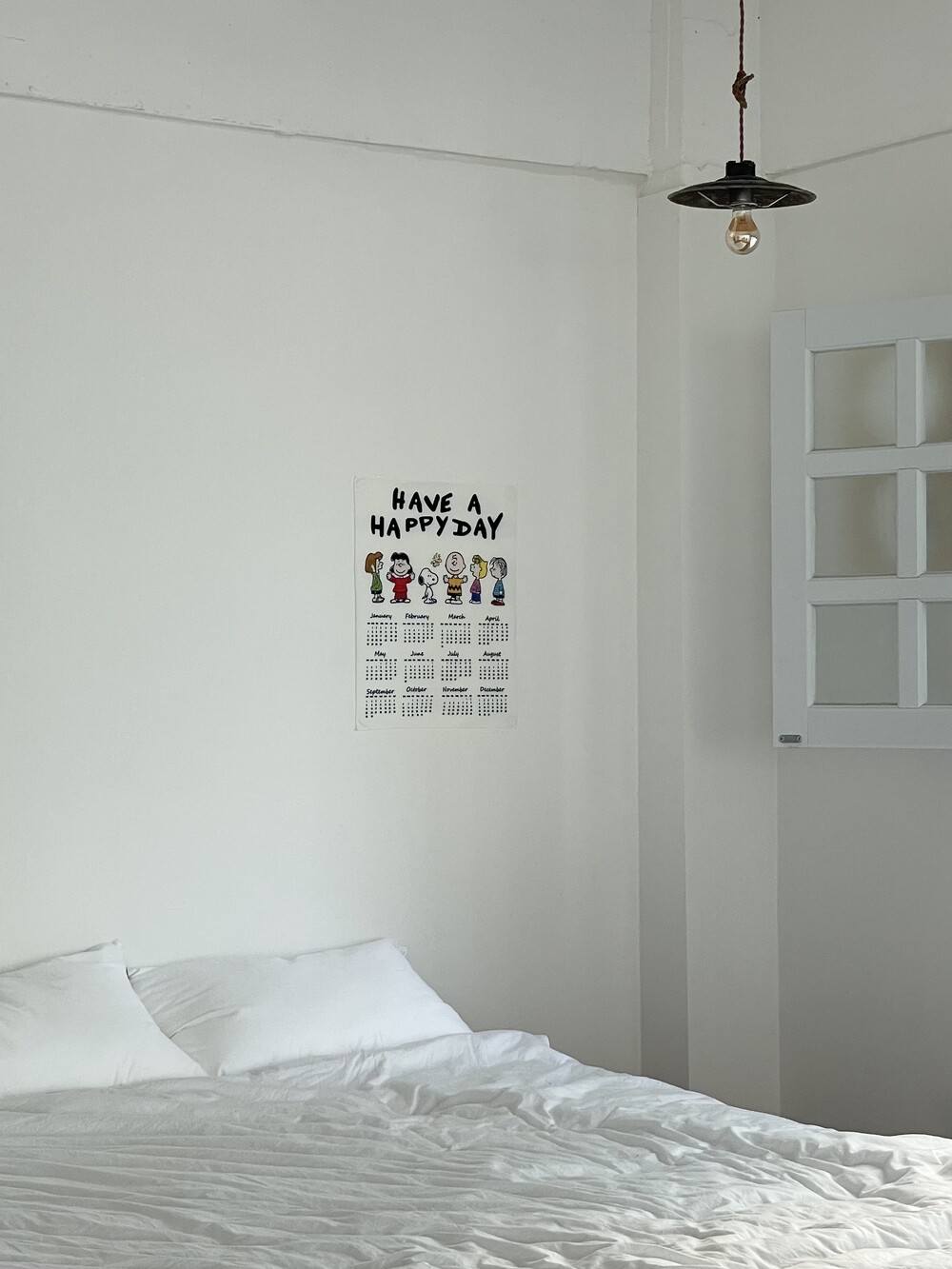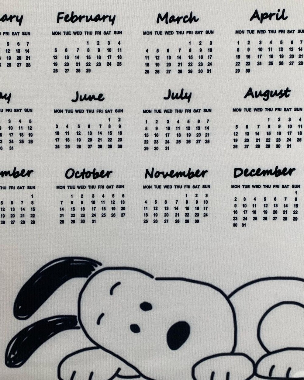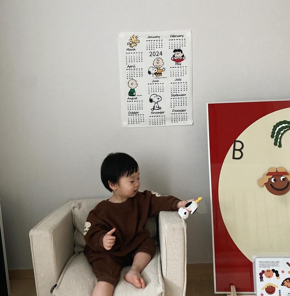 "우리집 곳곳 어디든 두어도 이쁜 페브릭 달력. 엄마 최애 캐릭터가 스누핀데 너도 좋아할줄 알았지! 손가락으로 가리키며 멈머하는데 귀여워 미쵸♥"