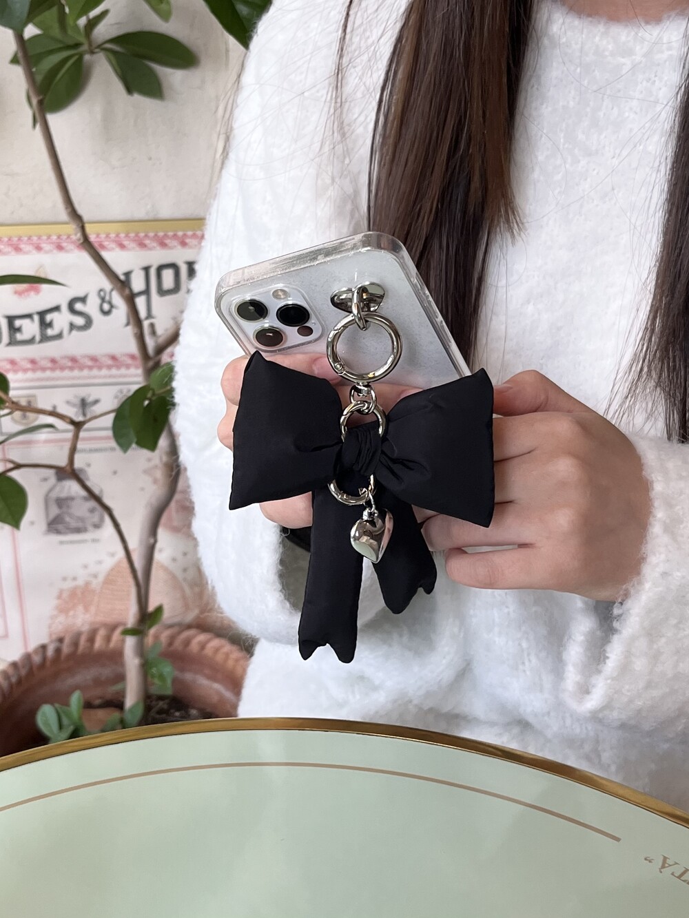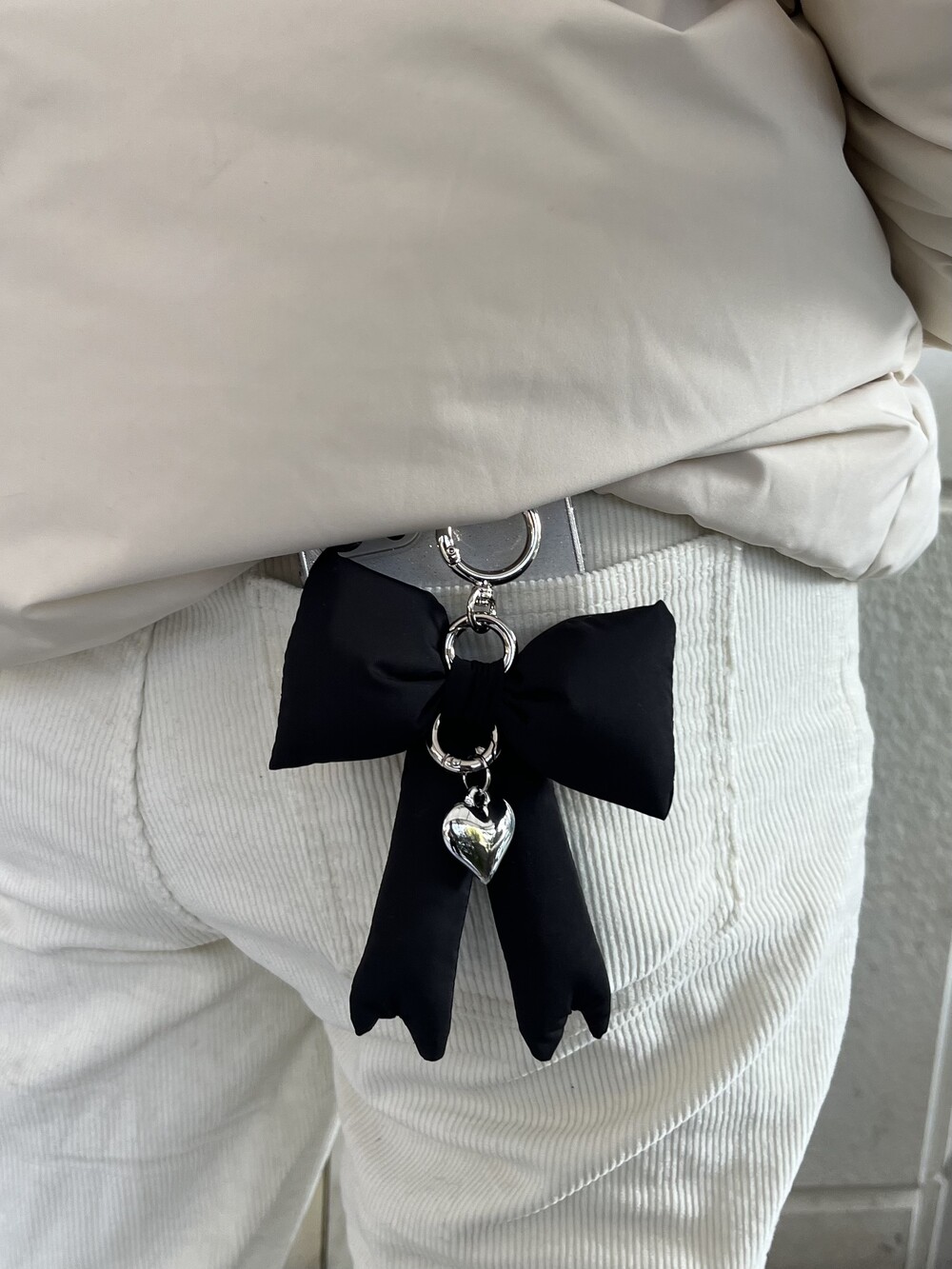 실버 하트참이 달려있어 더욱 더 귀여워요. 가방에 달거나, 실버 하트고리판을 추가로 구입하시면, 핸드폰 악세사리로도 가능해요. 거울셀카 찍을 때 리본이 돋보여 더욱 귀엽답니다.