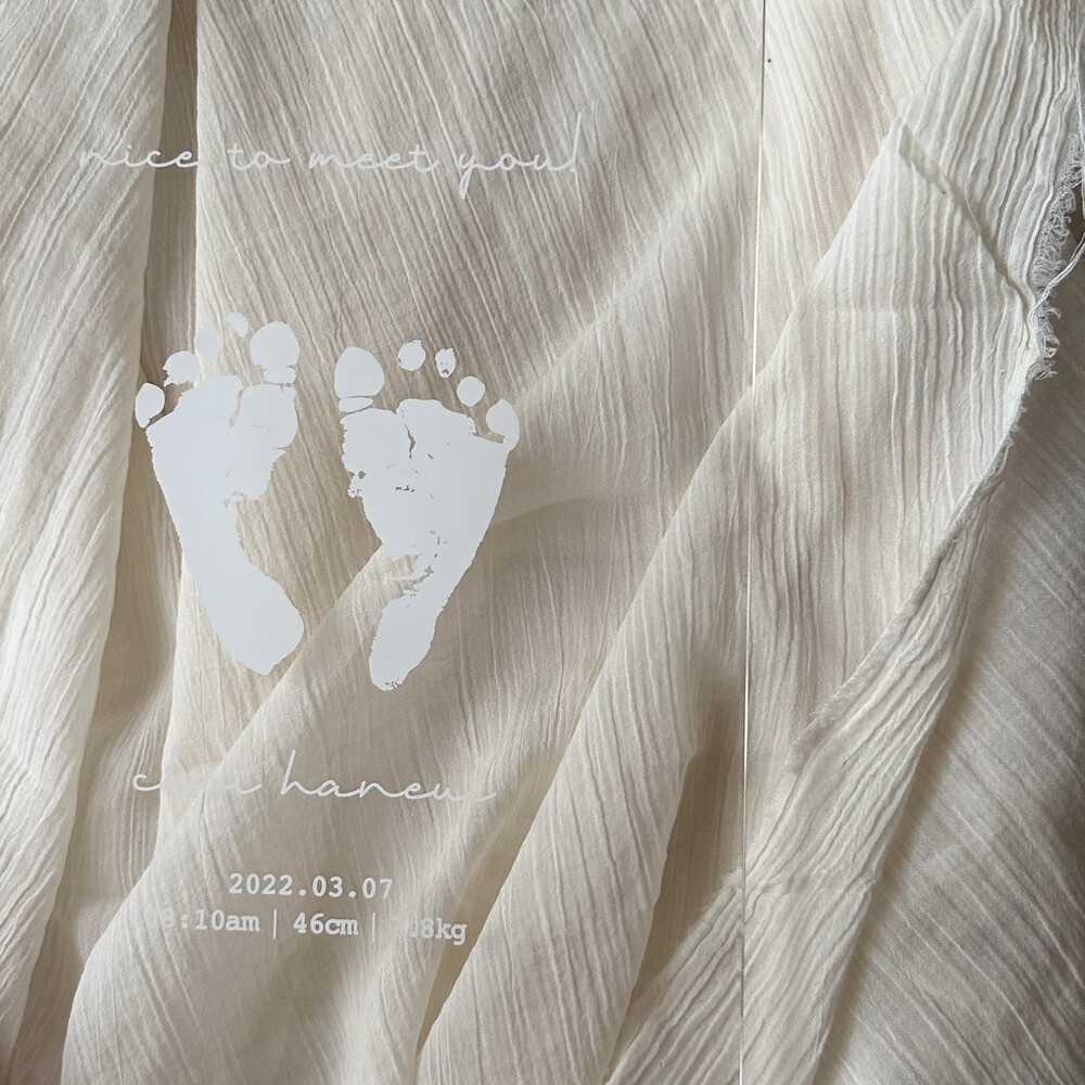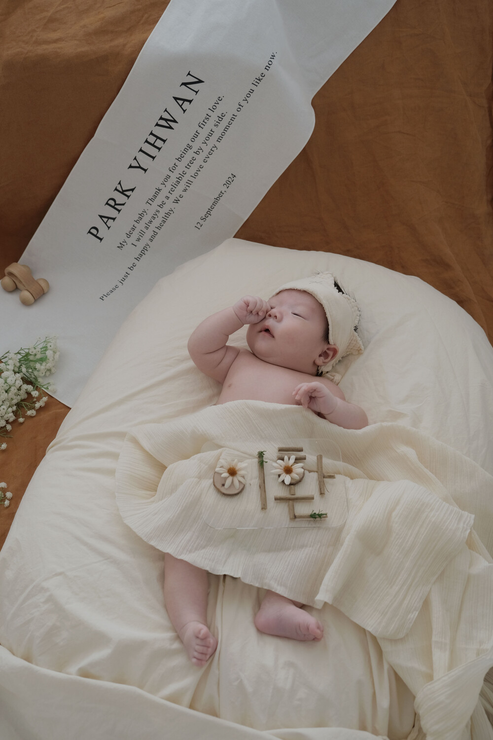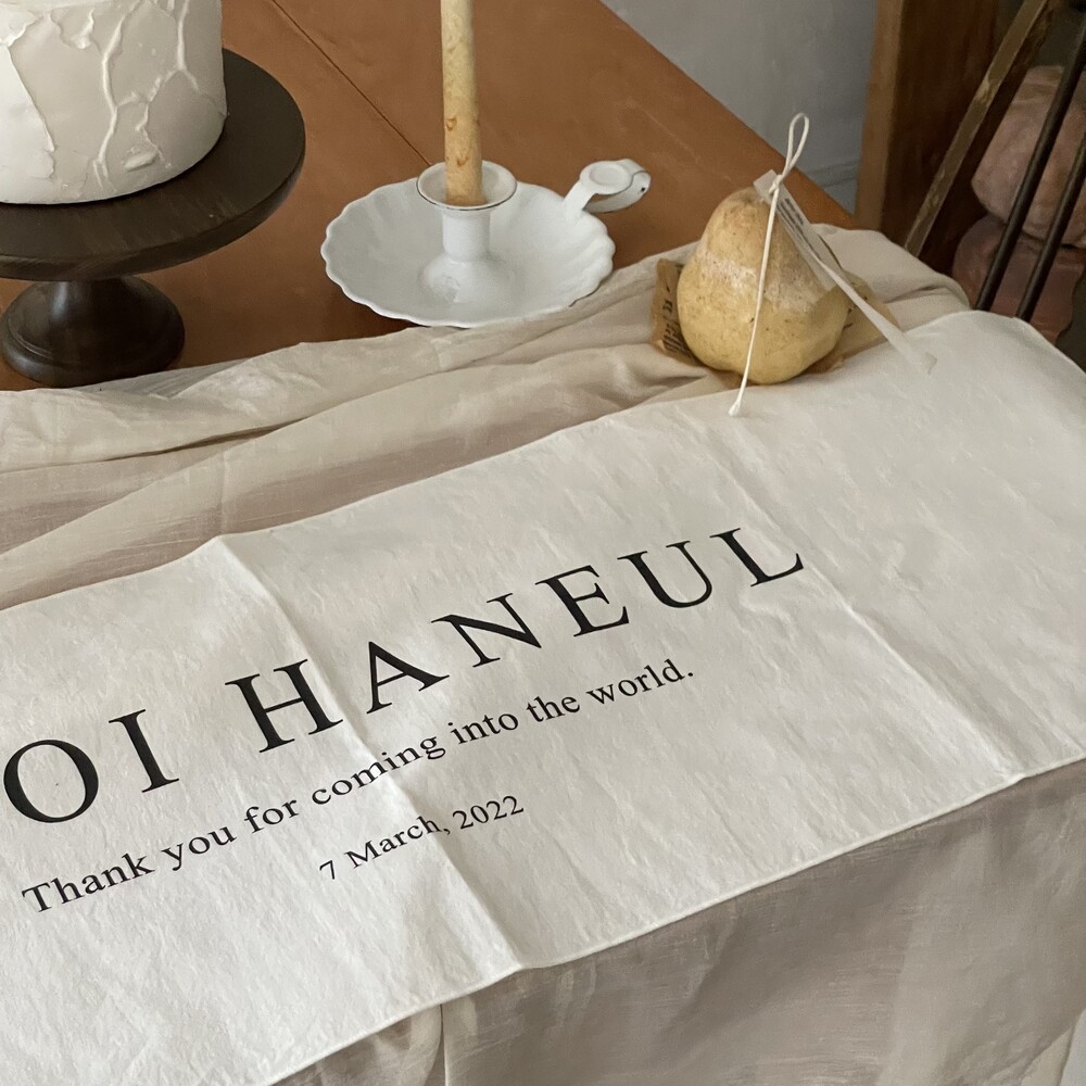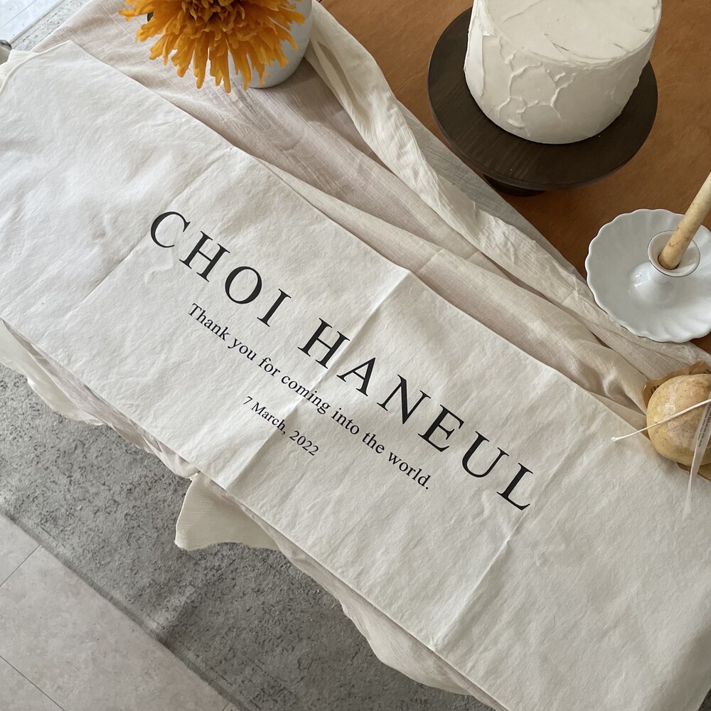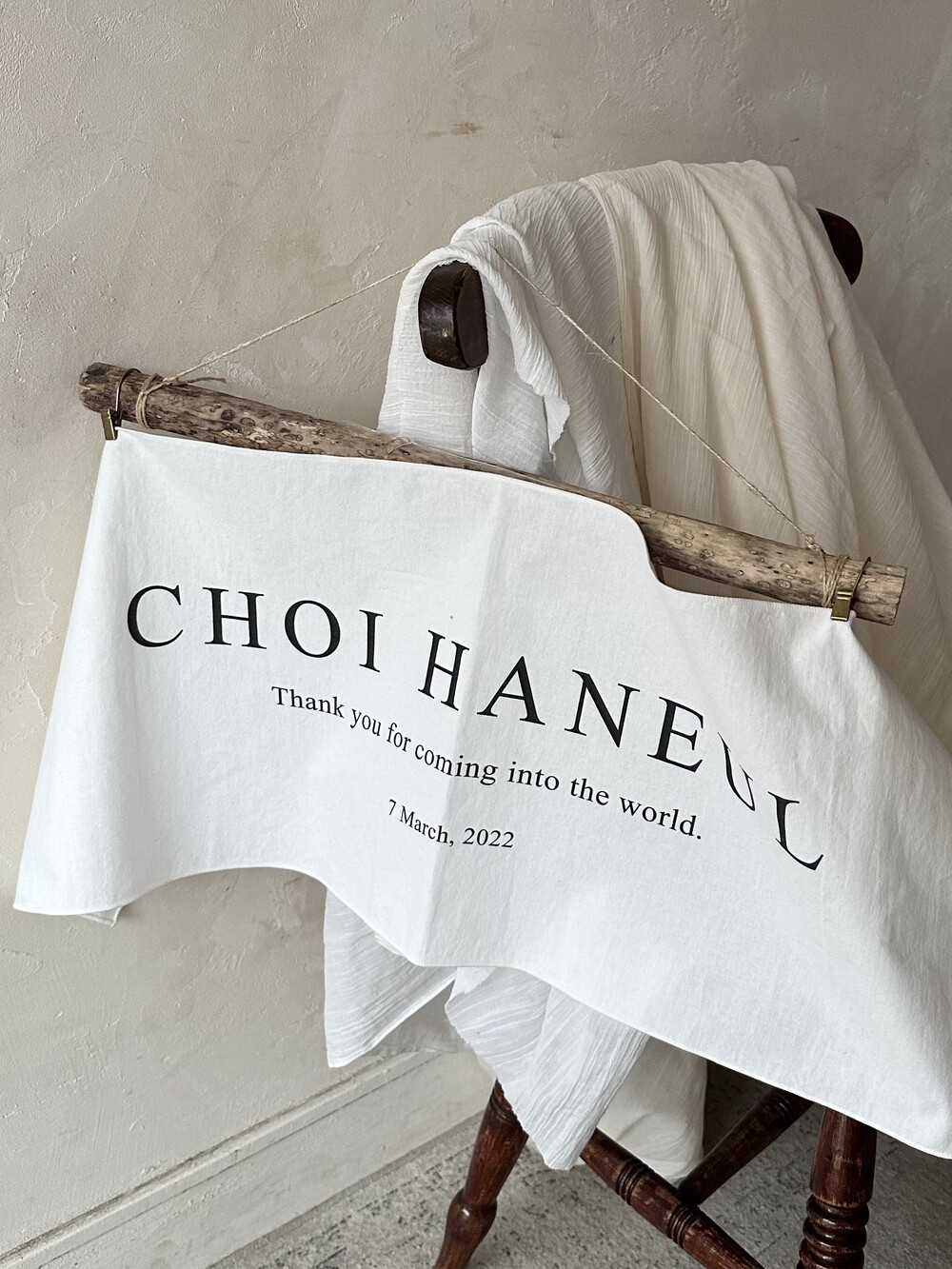 요루 코튼 베이지 위에 메린드레 이니셜패브릭포스터를 올려두어 아기 기념일 사진을 촬영하였어요.
