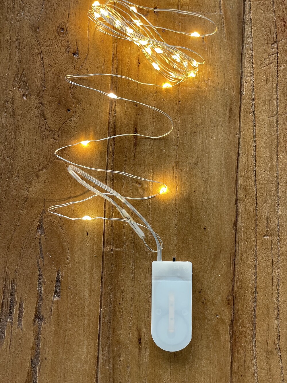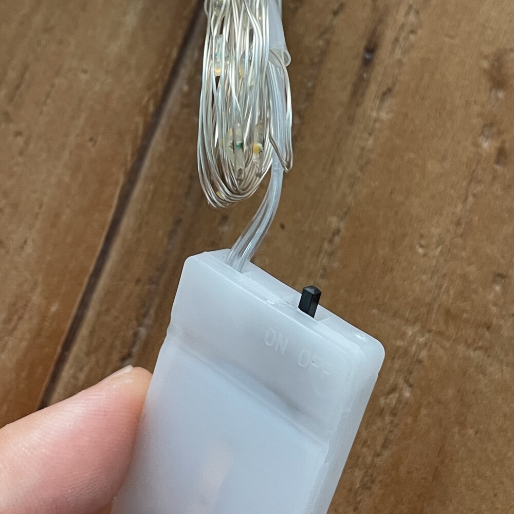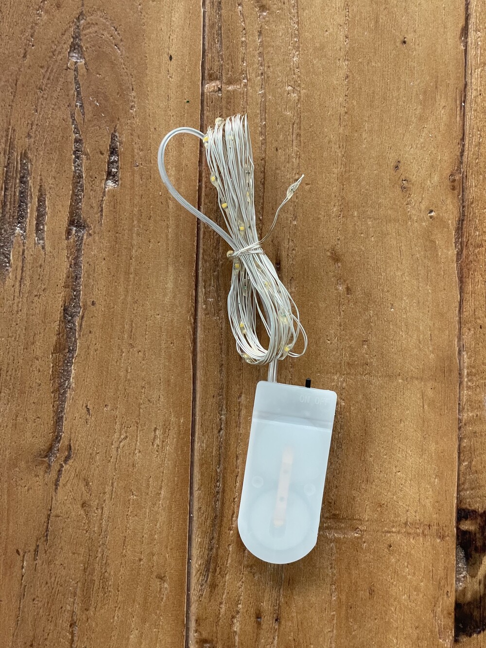 와이어 LED 30구 수은전지포함 줄조명은 트리 위에서부터 아래로 돌려가며 설치해주세요. 설치 후 건전지는 우드받침대 위에 올려두면 편리합니다.