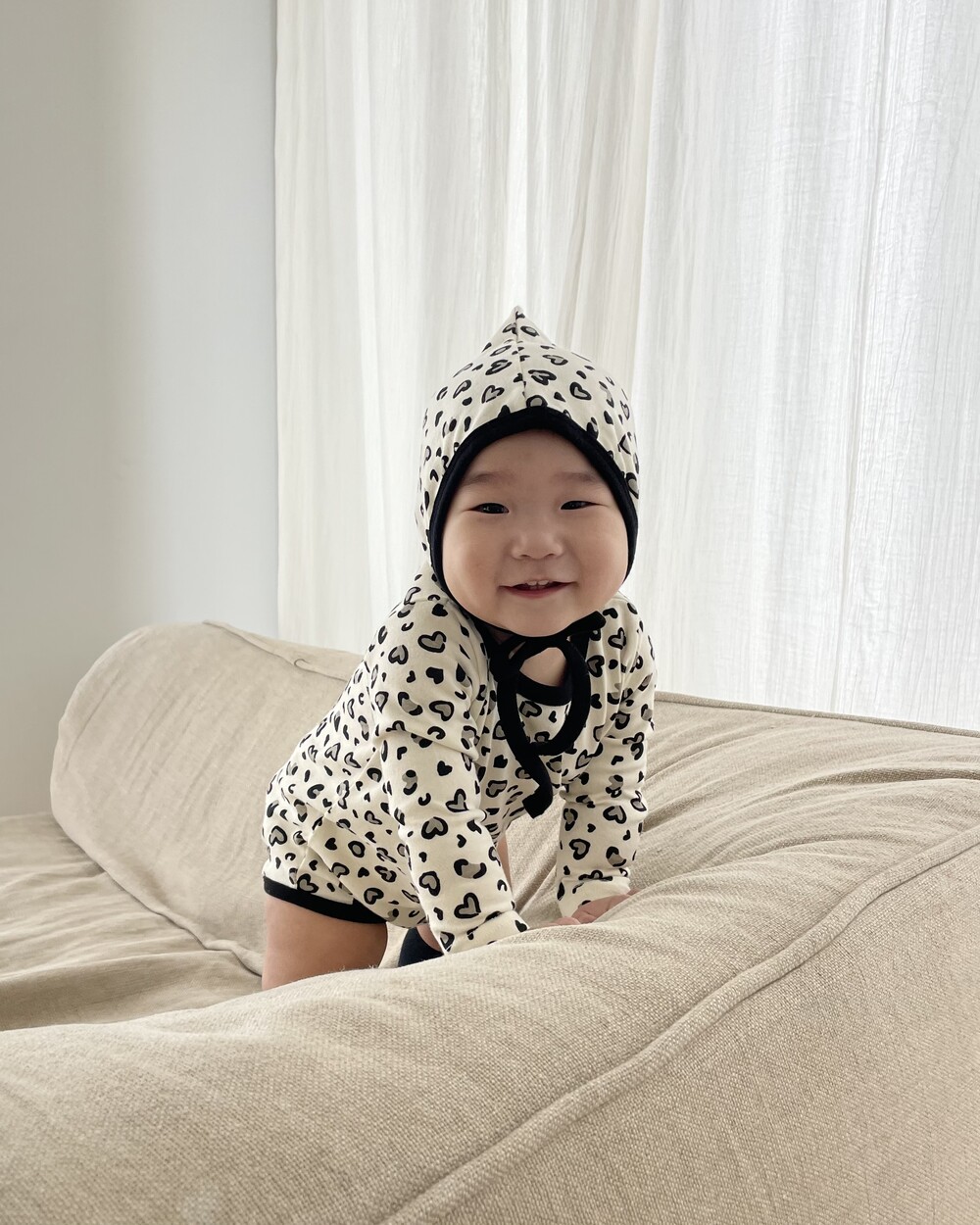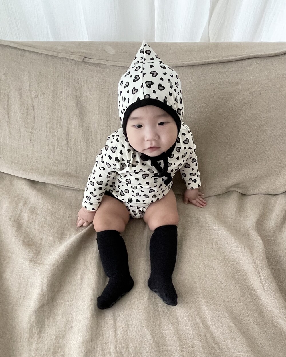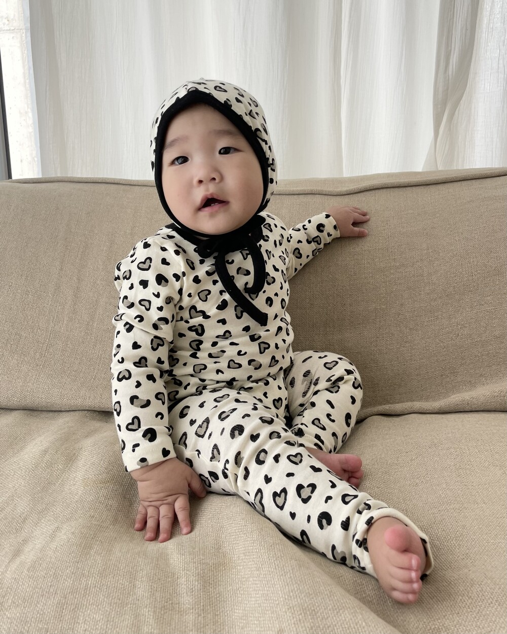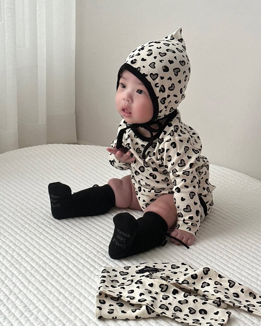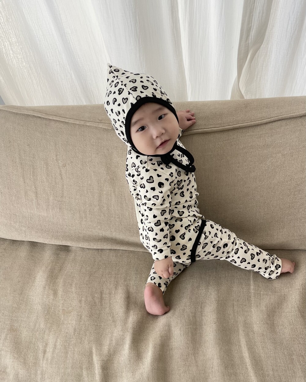 보넷+바디수트+배앓이방지 레깅스 3pcs 세트로 제작된 상품입니다. 사랑스러운 하트모양 호피패턴으로 입으면 귀여운 아기맹수로 변신한답니다. 후라이스 스판 원단으로 신축성이 좋아 아이들이 편하게 착용가능해요.