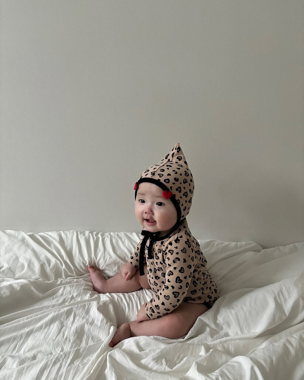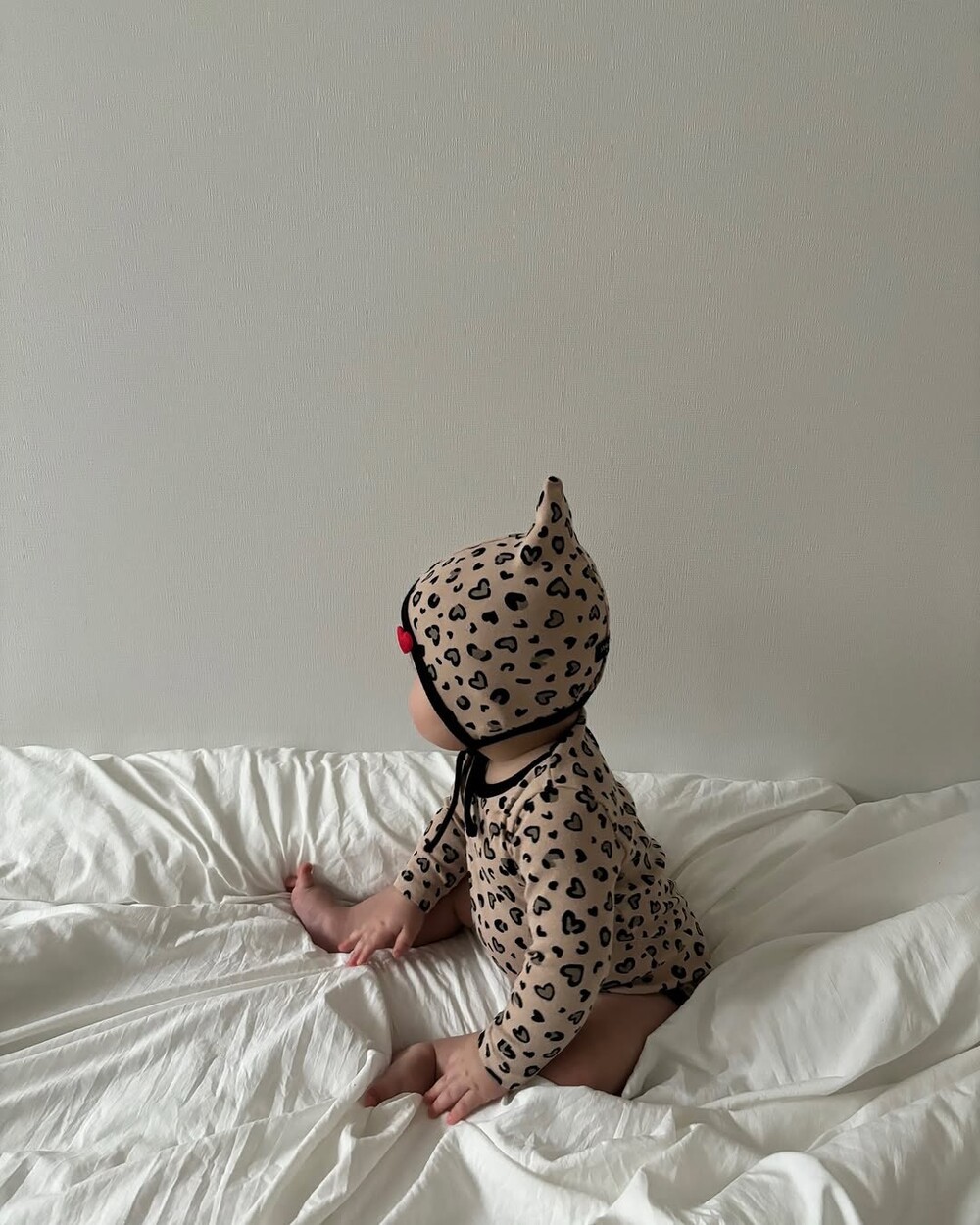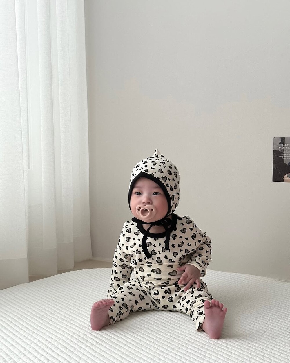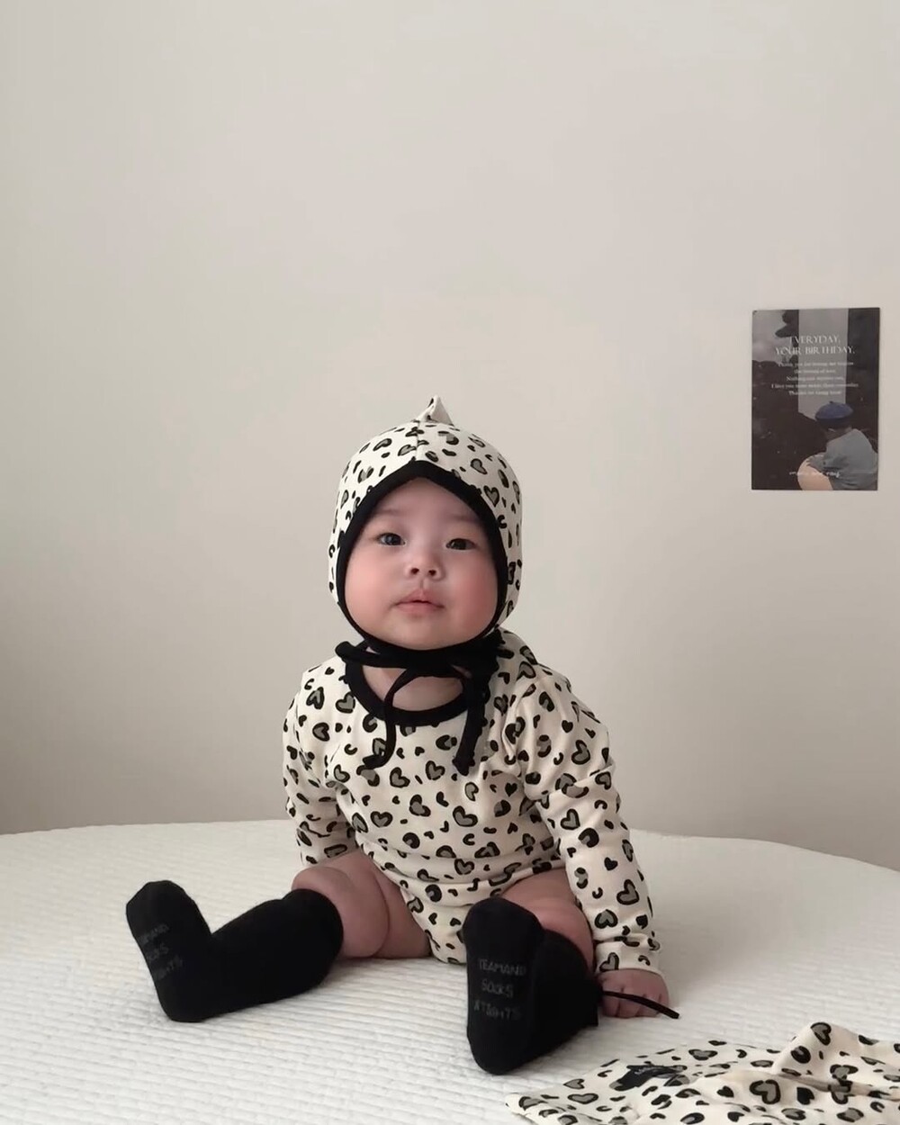 보넷+바디수트+배앓이방지 레깅스 3pcs 세트로 제작된 상품입니다. 사랑스러운 하트모양 호피패턴으로 입으면 귀여운 아기맹수로 변신한답니다. 후라이스 스판 원단으로 신축성이 좋아 아이들이 편하게 착용가능해요.