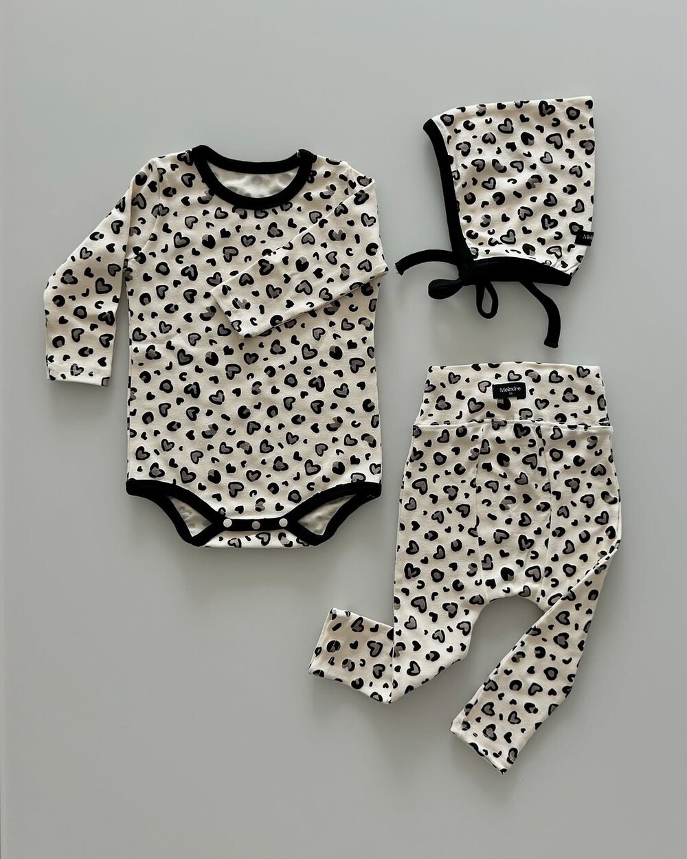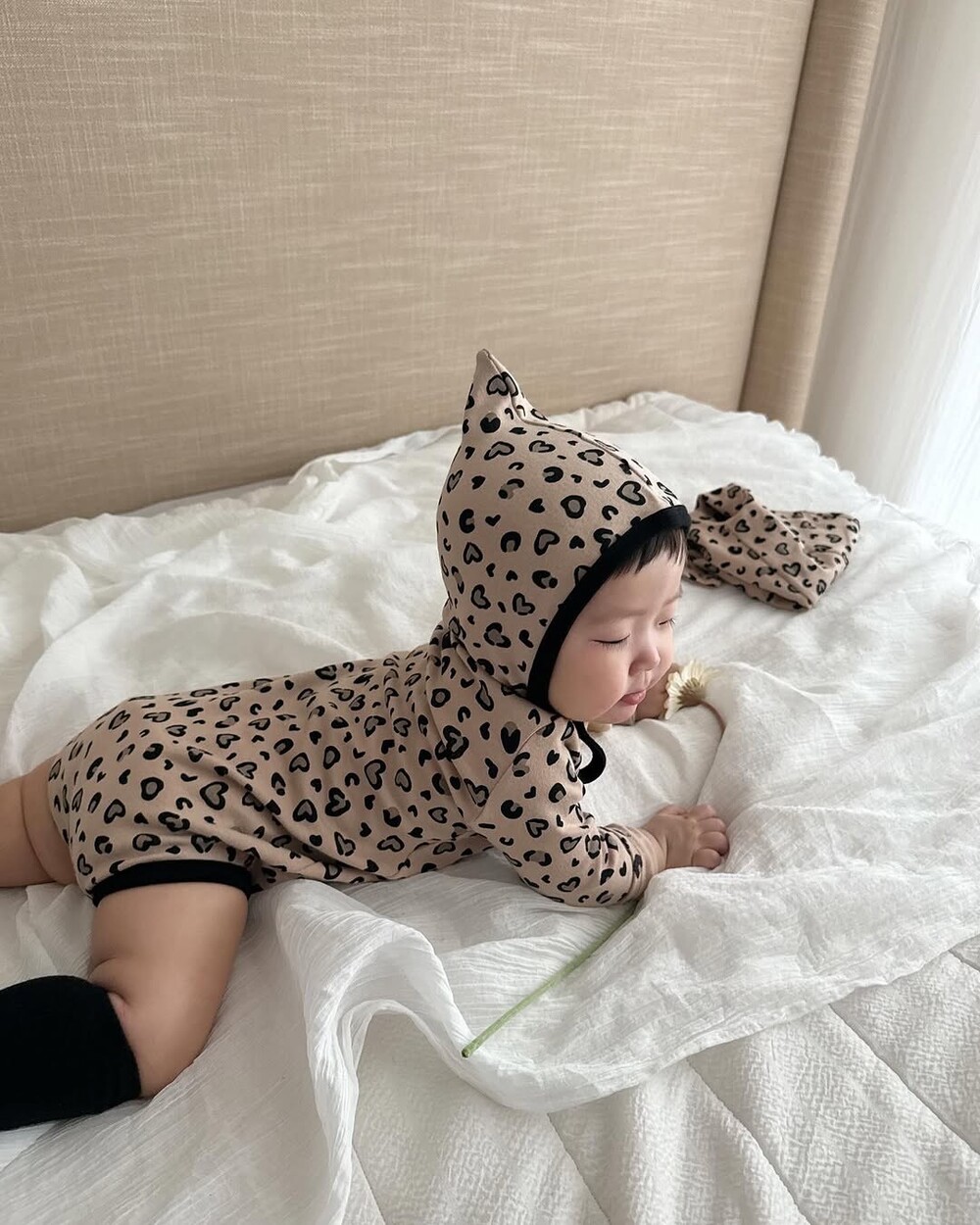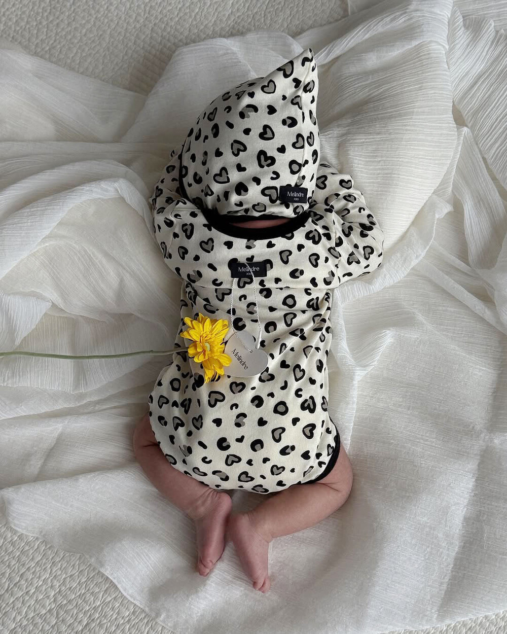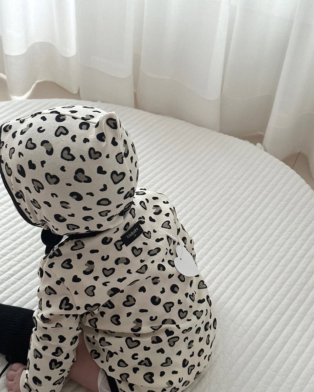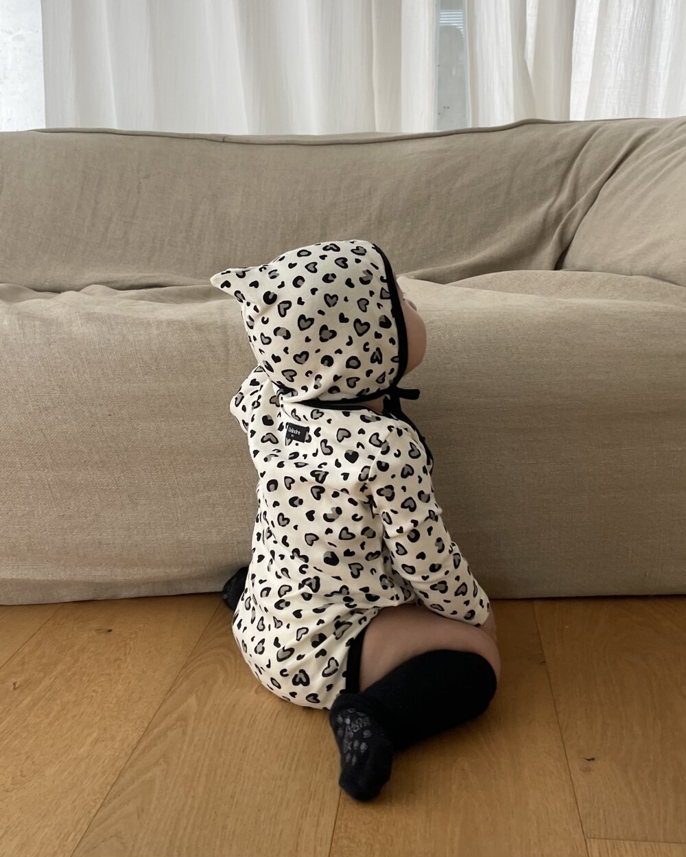 보넷+바디수트+배앓이방지 레깅스 3pcs 세트로 제작된 상품입니다. 사랑스러운 하트모양 호피패턴으로 입으면 귀여운 아기맹수로 변신한답니다. 후라이스 스판 원단으로 신축성이 좋아 아이들이 편하게 착용가능해요.