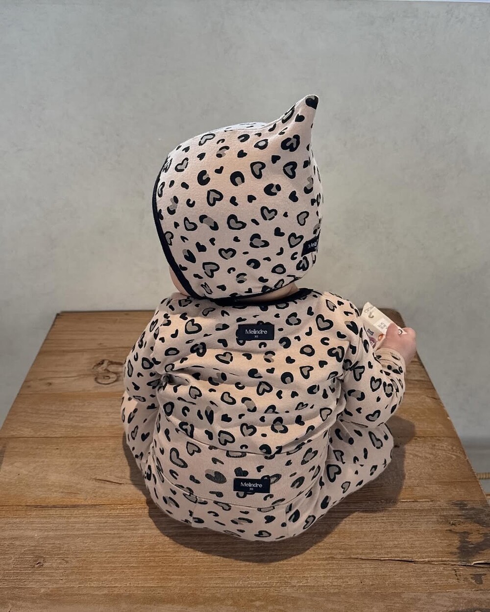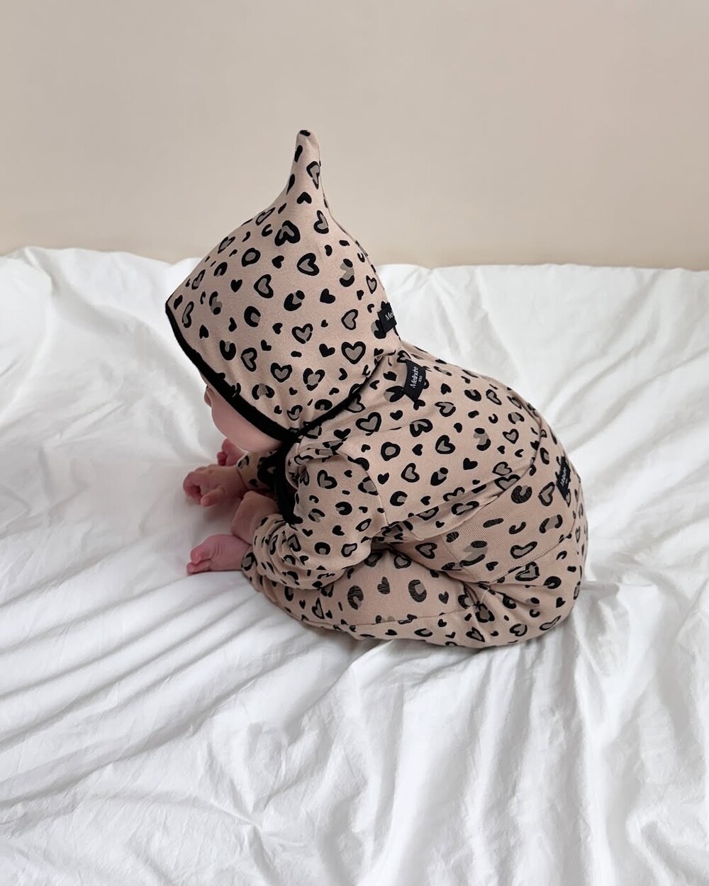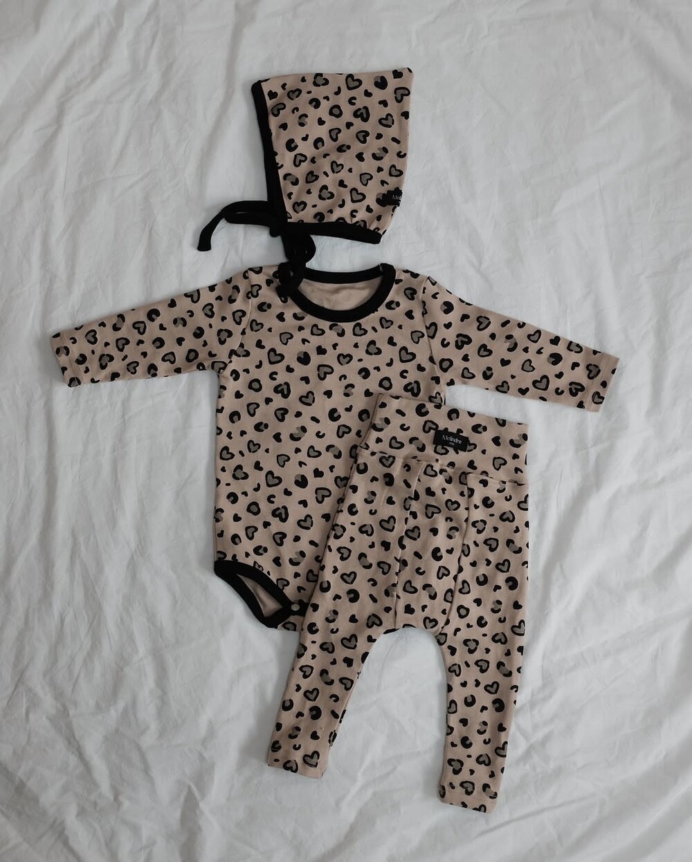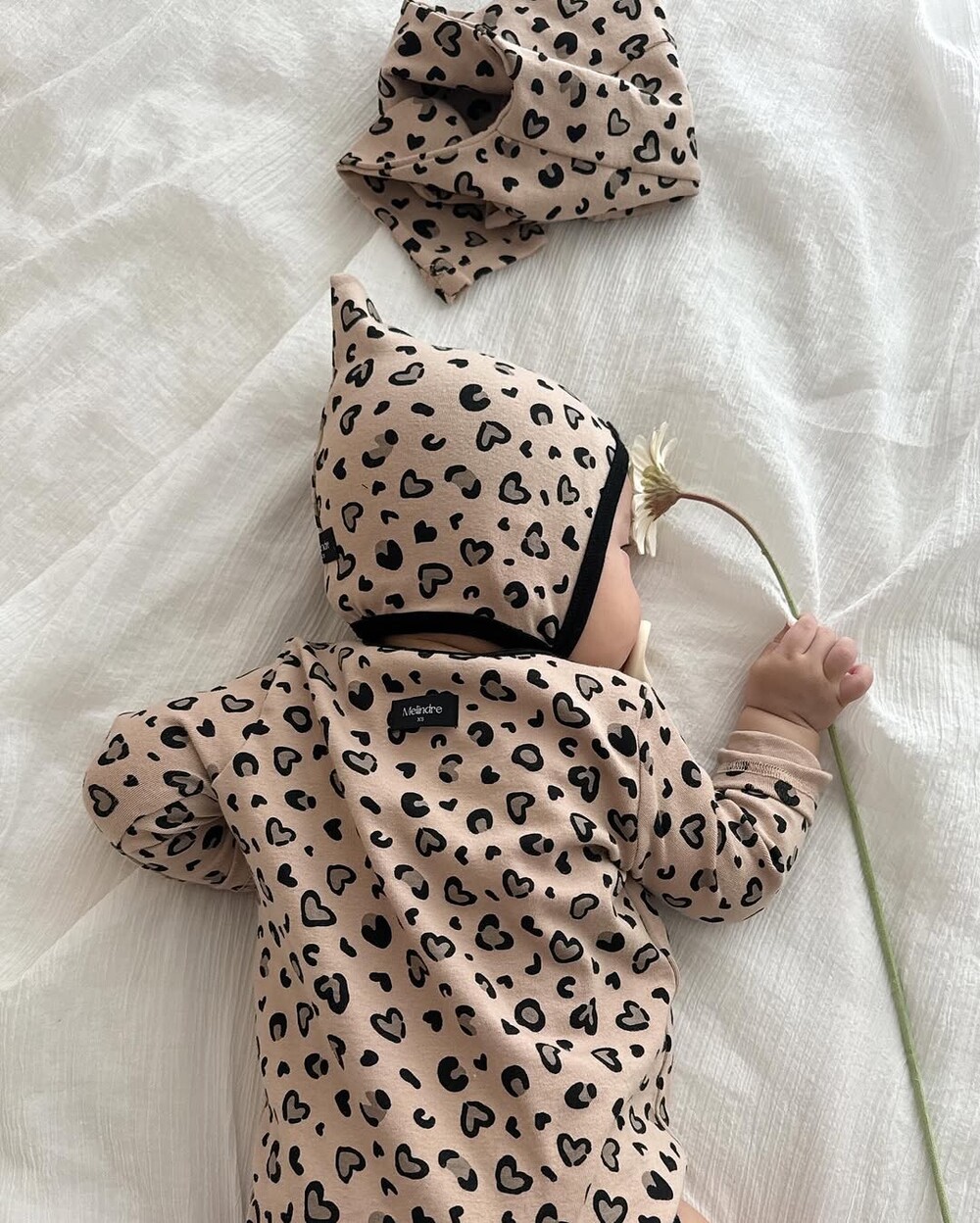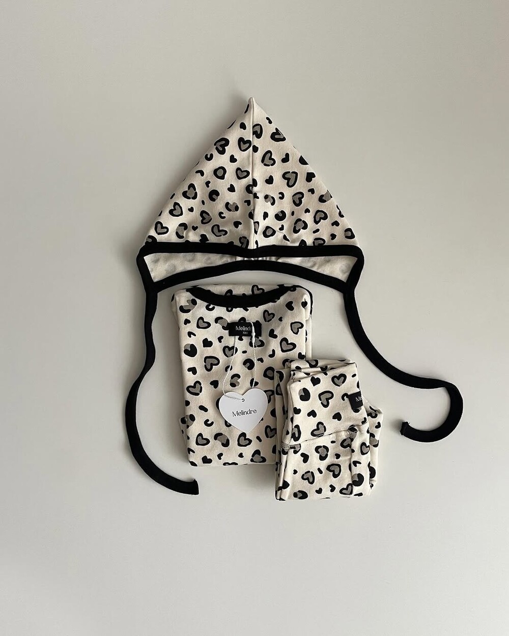 보넷+바디수트+배앓이방지 레깅스 3pcs 세트로 제작된 상품입니다. 사랑스러운 하트모양 호피패턴으로 입으면 귀여운 아기맹수로 변신한답니다. 후라이스 스판 원단으로 신축성이 좋아 아이들이 편하게 착용가능해요.