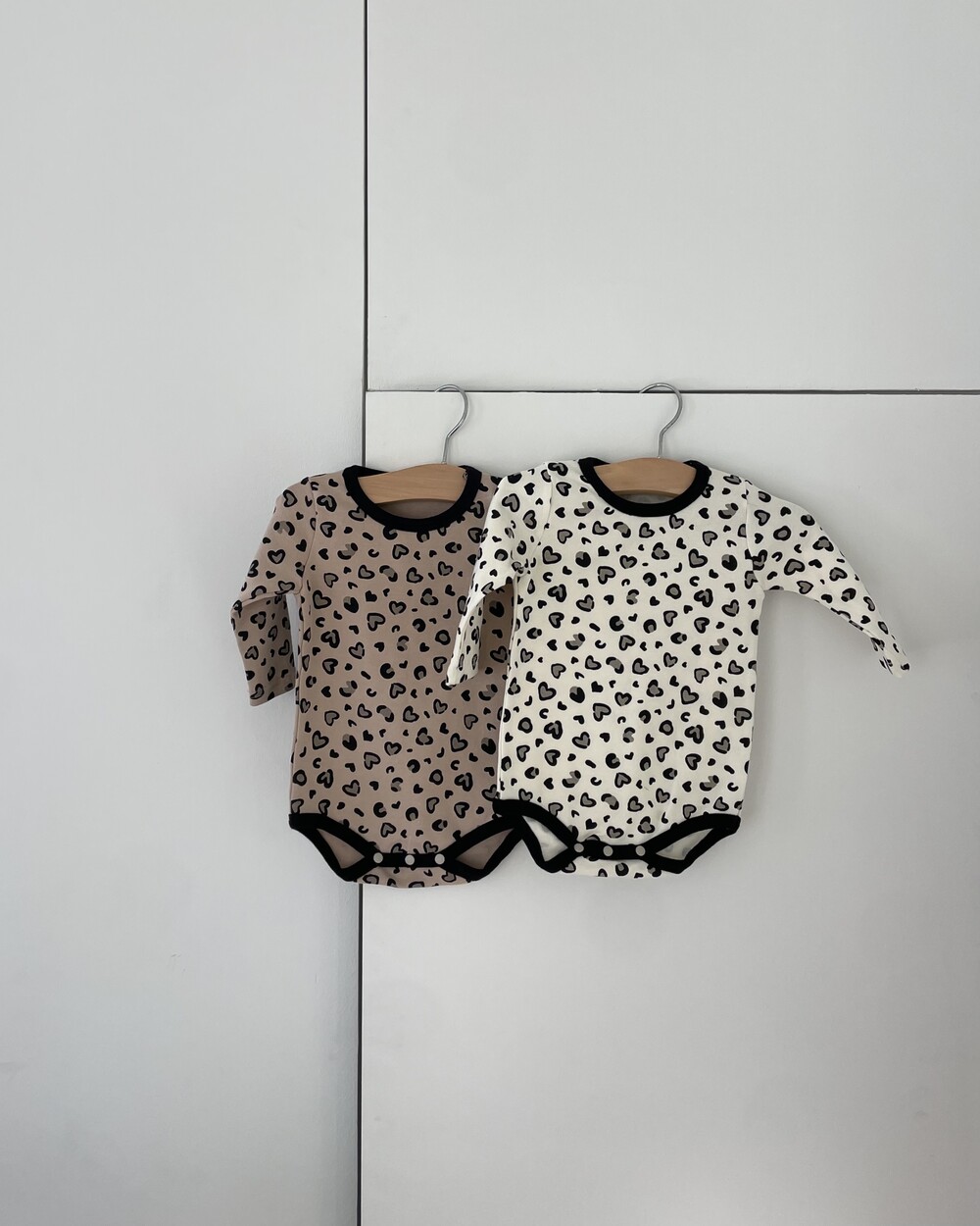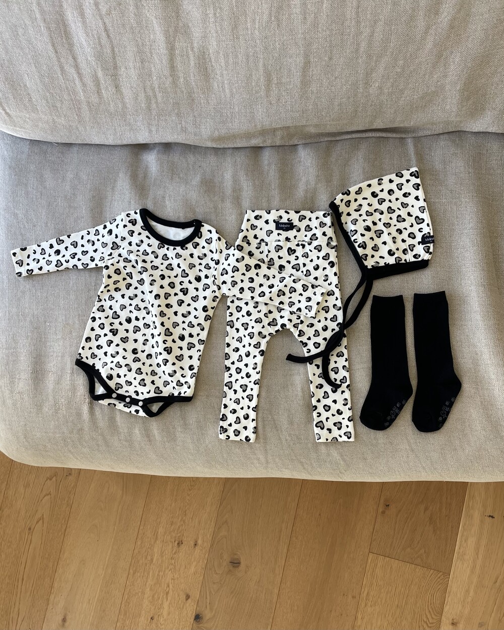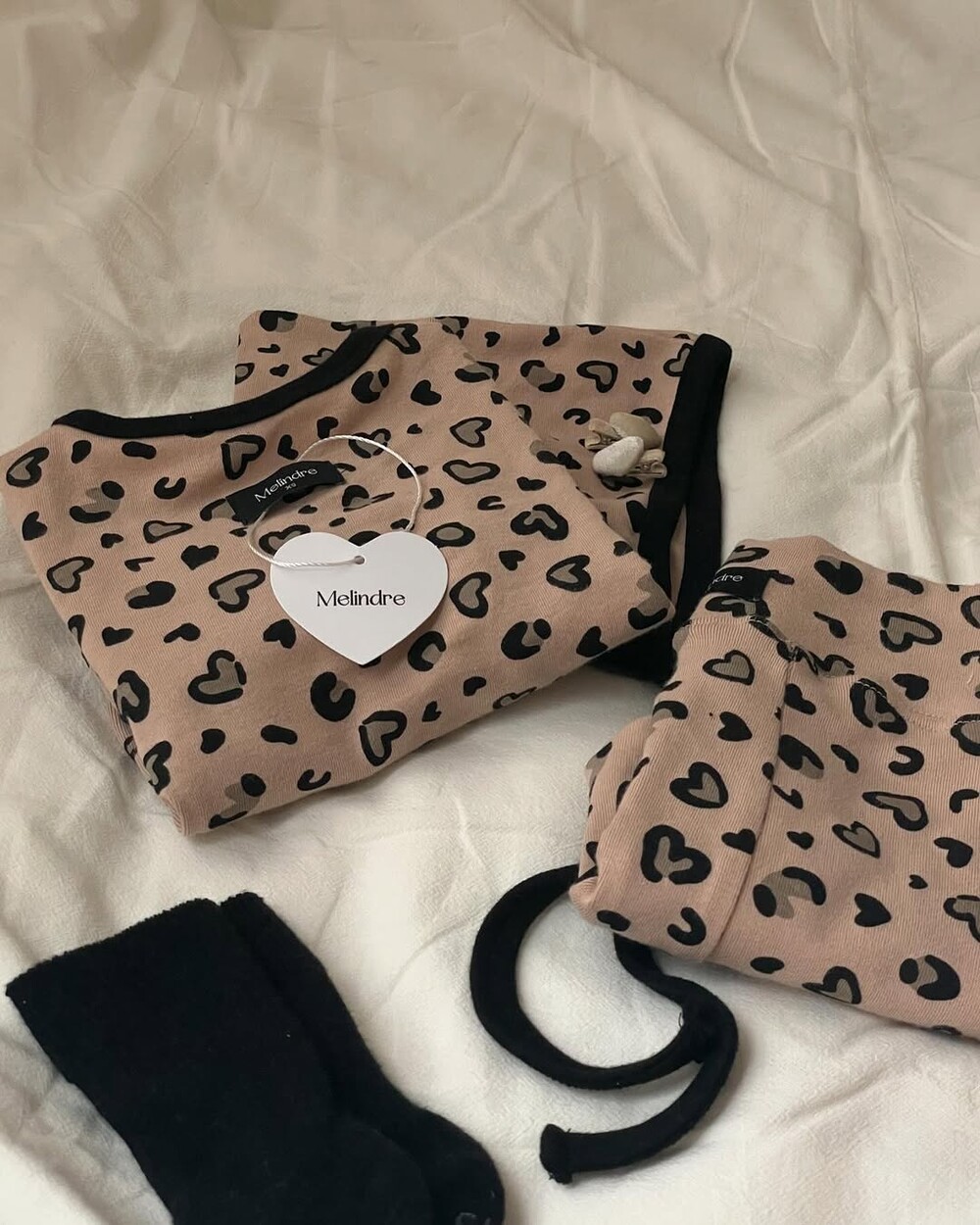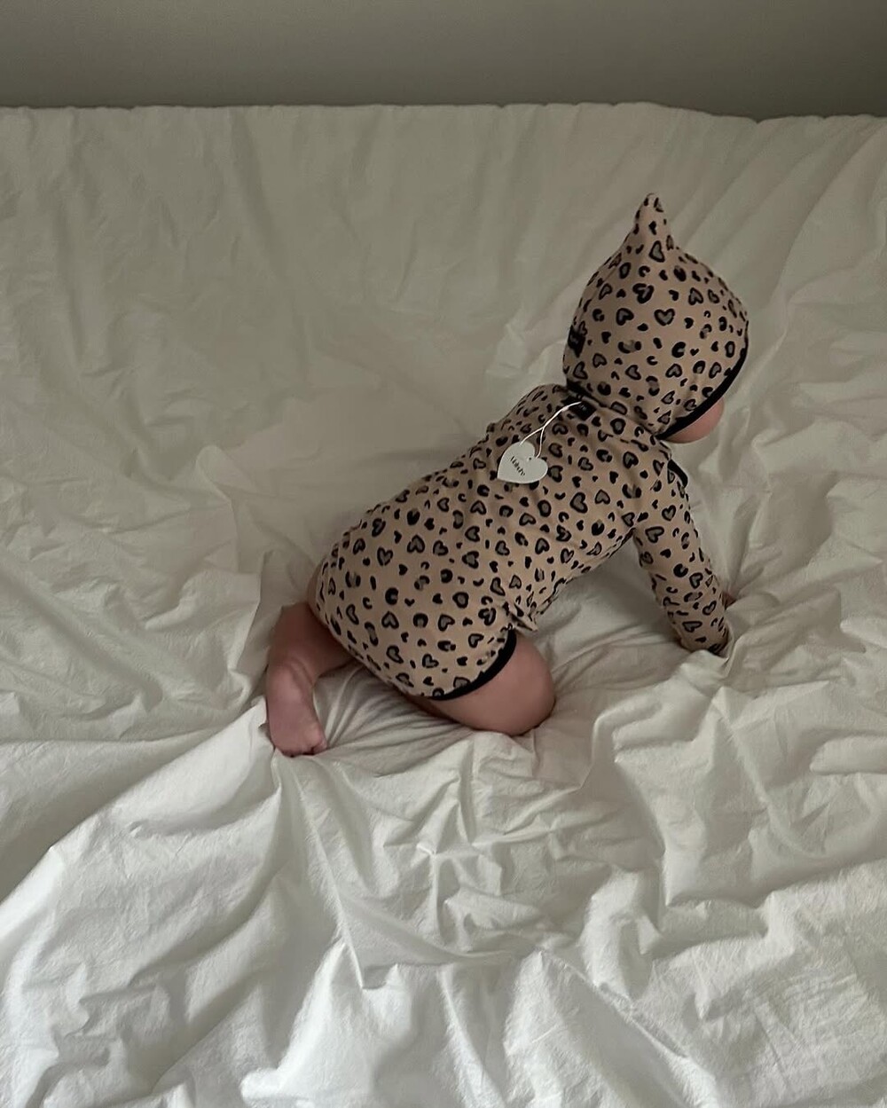 보넷+바디수트+배앓이방지 레깅스 3pcs 세트로 제작된 상품입니다. 사랑스러운 하트모양 호피패턴으로 입으면 귀여운 아기맹수로 변신한답니다. 후라이스 스판 원단으로 신축성이 좋아 아이들이 편하게 착용가능해요.