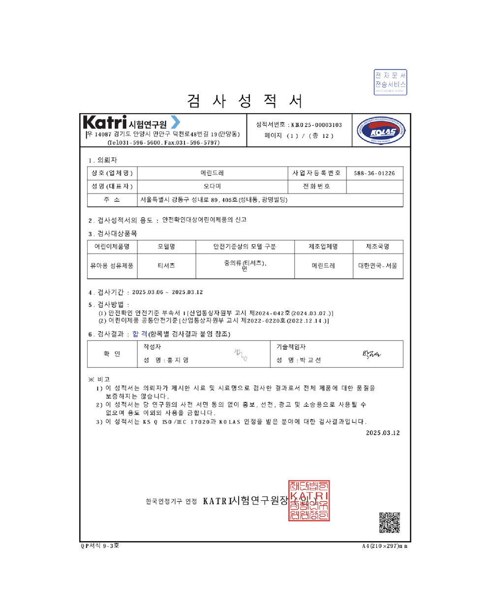 국내생산하였고, KC안전인증을 획득해 우리아이에게 안심하고 입힐 수 있어요.