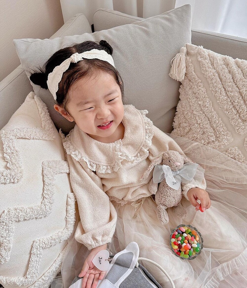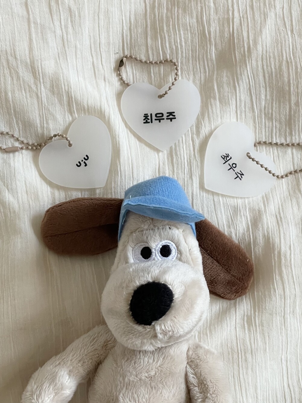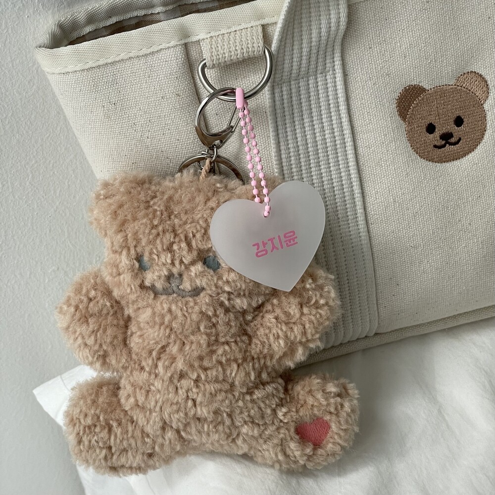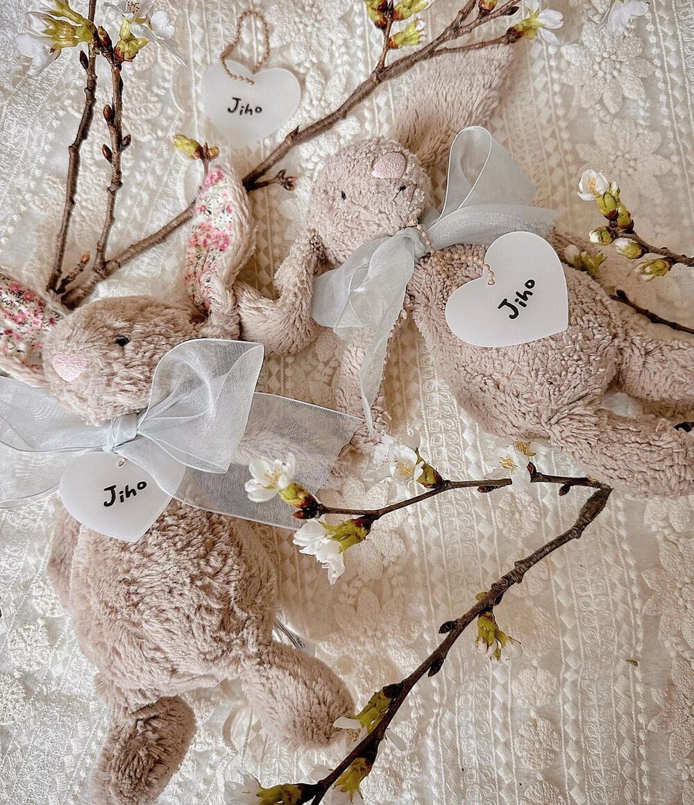 "얼집 등원을 함께하고 있는 지호의 아기토끼. 흔한 디자인이라 친구랑 바뀐적도 있어자기 토끼인형 아니라고 얼마나 슬퍼하던지, 지호 이름을 새긴 하트 아크릴 네임텍을 목걸이로달아주니 이제 헷갈릴 염려도 없어 다행이네요"